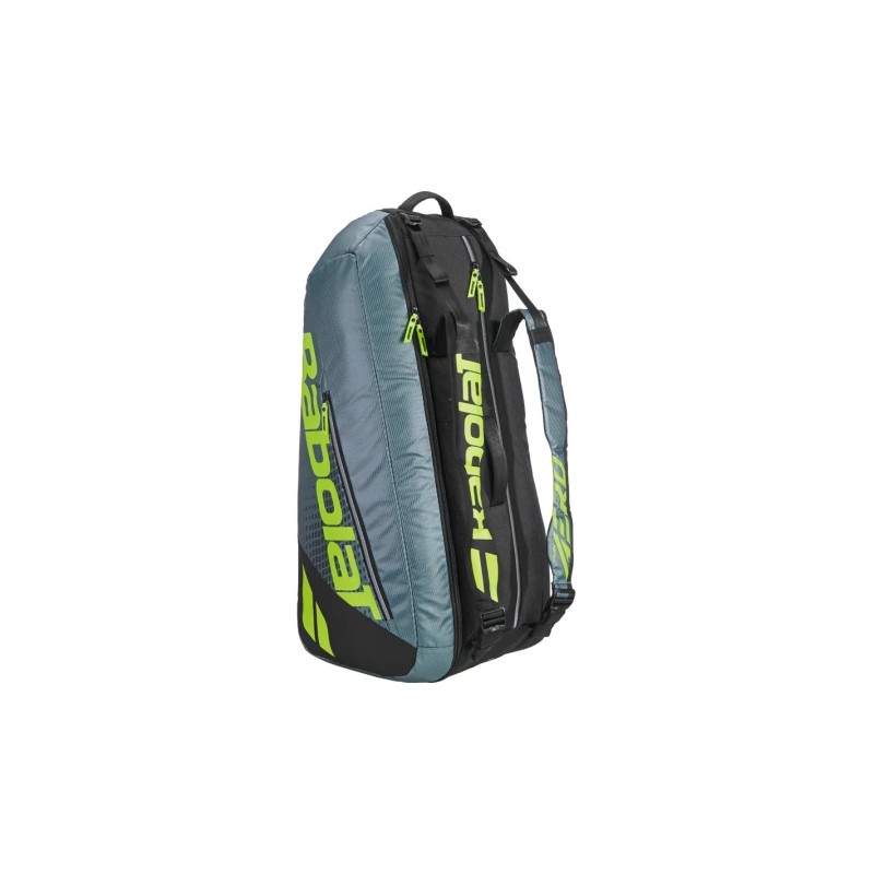 La bolsa tiene dos compartimentos principales para hasta 6 raquetas, además de tu ropa y accesorios esenciales. También hay un bolsillo ventilado para zapatillas o ropa húmeda, y varios bolsillos laterales para pequeños objetos y efectos personales.